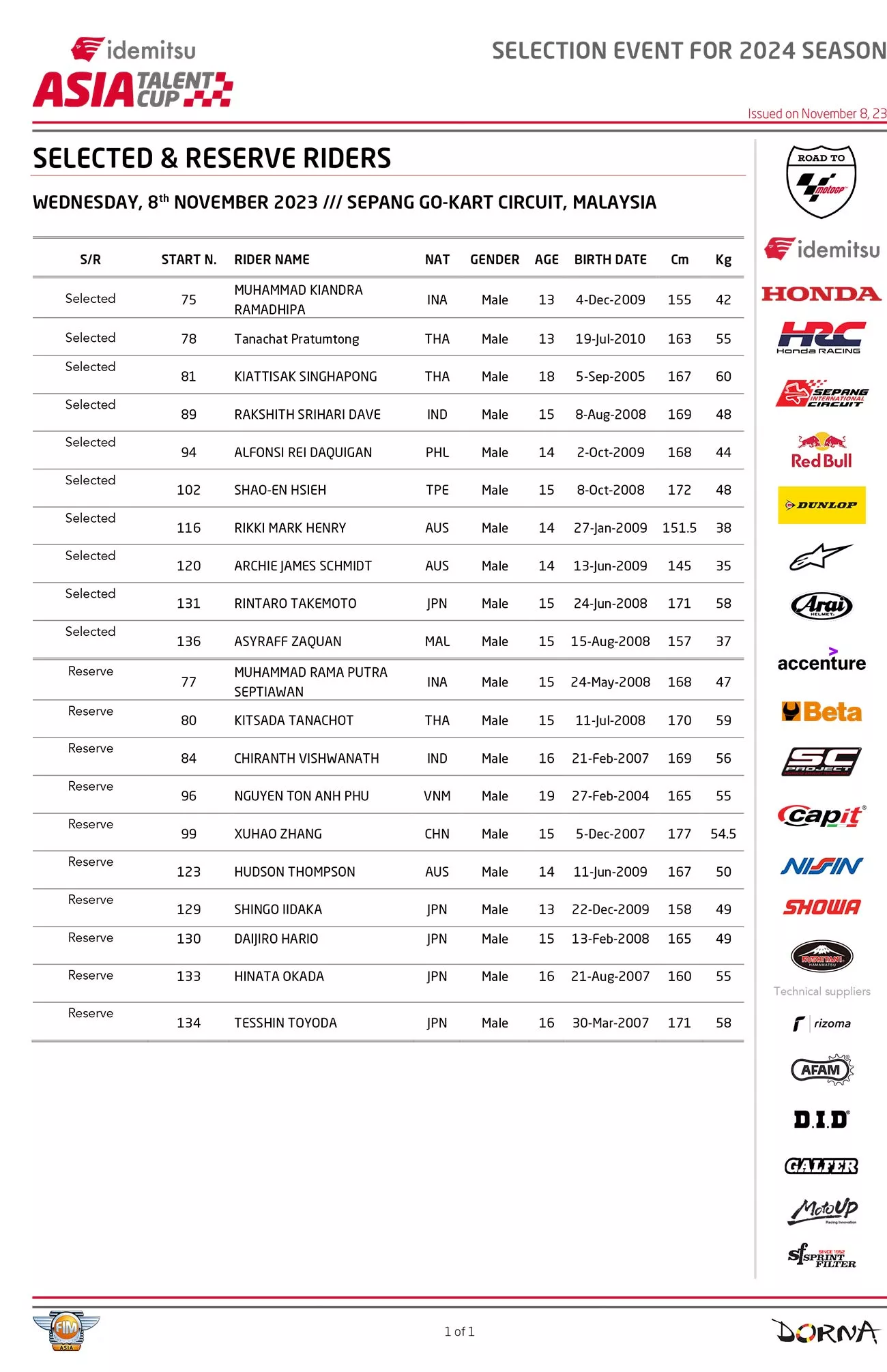 Sementara itu, pembalap asal Cirebon yaitu Muhammad Rama Putra Septiawan masuk kedalam list 10 pembalap yang lolos menjadi rider cadangan.