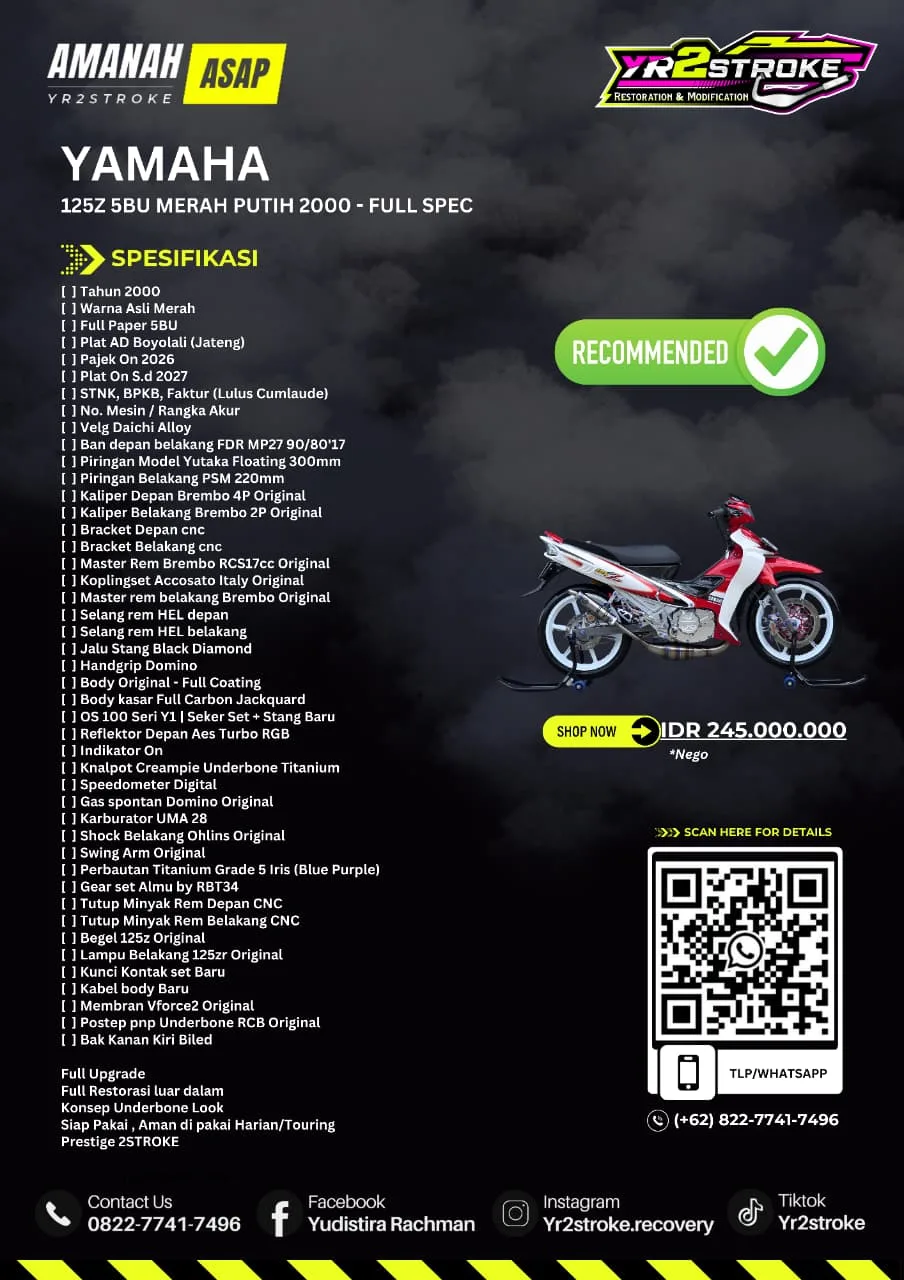 Unit yang ditawarkan adalah Yamaha 125Z lansiran tahun 2000 dengan warna asli merah. Kelengkapan surat-suratnya pun aman, mulai dari STNK, BPKB, faktur, hingga pajak hidup sampai 2026 dan plat on sampai 2027.