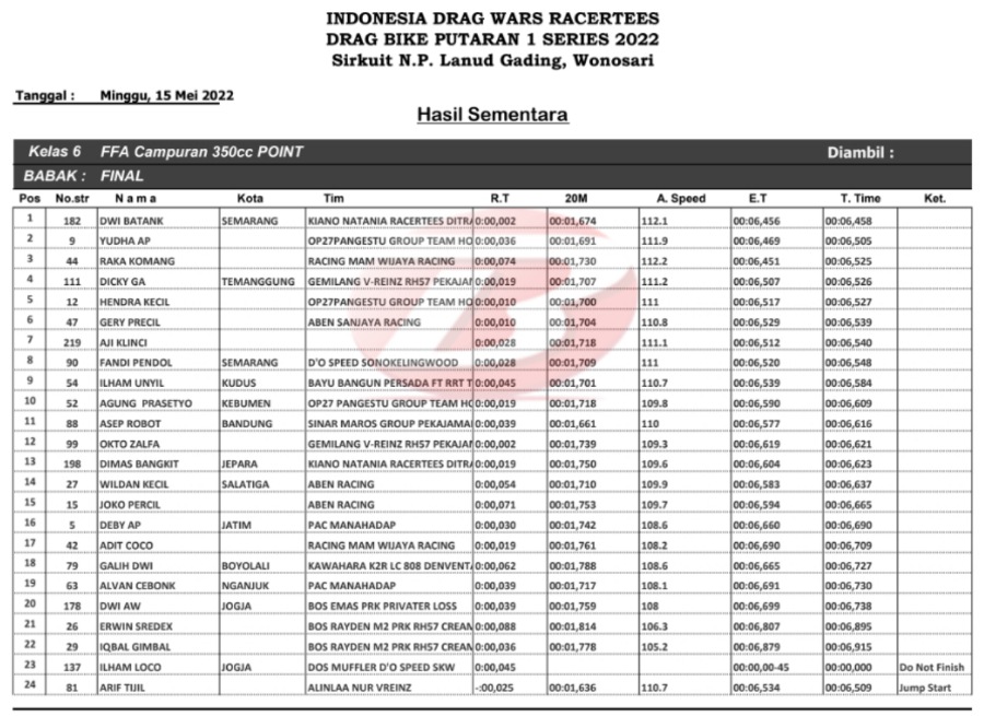 Tak hanya comeback semata, namun Yamaha MX-King yang pertama kali mengawali pertarungan 4 tak dengan 2 tak di kelas FFA itu langsung meraih predikat juara. Ya, pelakunya Dwi Batank. Pembalap Semarang itu mencatat waktu terbaik 6,458 detik.