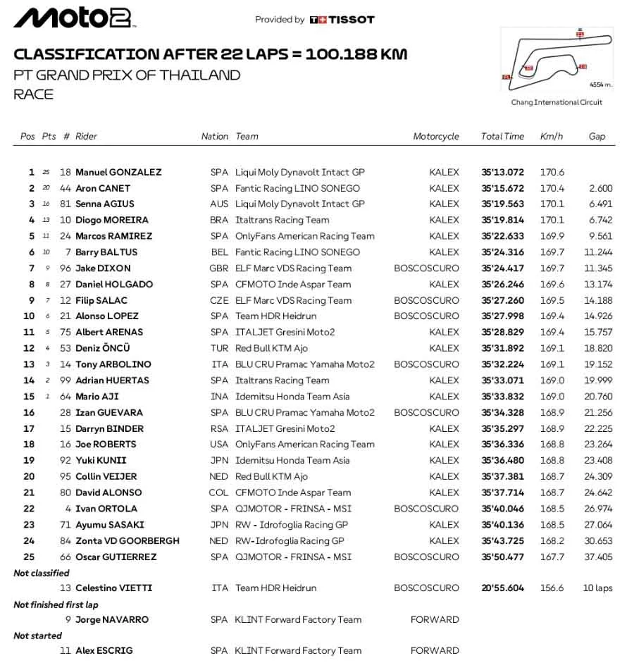 Sementara podium kedua diraih pembalap senior Aron Canet diikuti oleh Senna Agius yang mengalahkan Diogo Moreira dalam perebutan podium ketiga.