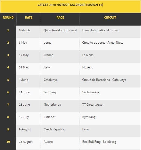 Mengikuti perubahan jadwal ini, kelas MotoGP musim 2020 bakal digelar perdana di Sirkuit Jerez Spanyol dari tanggal 1 hingga 3 Mei 2020.