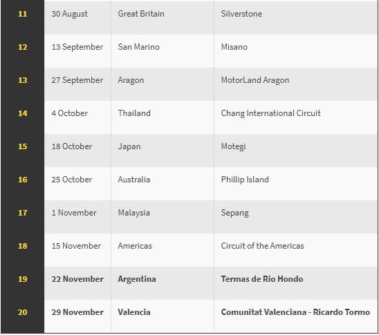 Dengan bergesernya seri Argentina ke akhir tahun 2020, hal tersebut berimbas dengan MotoGP Valencia yang mundur ke tanggal 27 hingga 29 November. Sementara MotoGP seri Amerika tetap mempertahankan jadwal barunya dari tanggal 13 hingga 15 November. Seminggu sebelum digelarnya MotoGP Argentina.