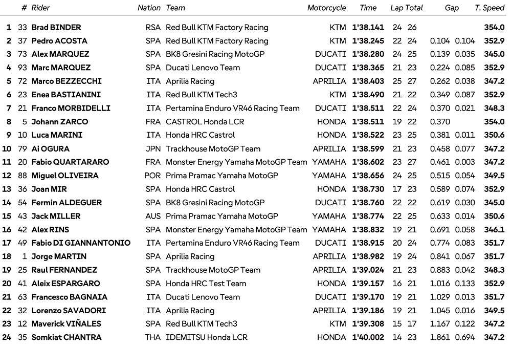 BalapMotor.Net – Brad Binder keluar sebagai pembalap tercepat pada sesi practice penentuan untuk menuju kualifikasi. Pembalap KTM tersebut unggul dari rekan setimnya, Pedro Acosta yang sebelumnya memimpin di FP1.