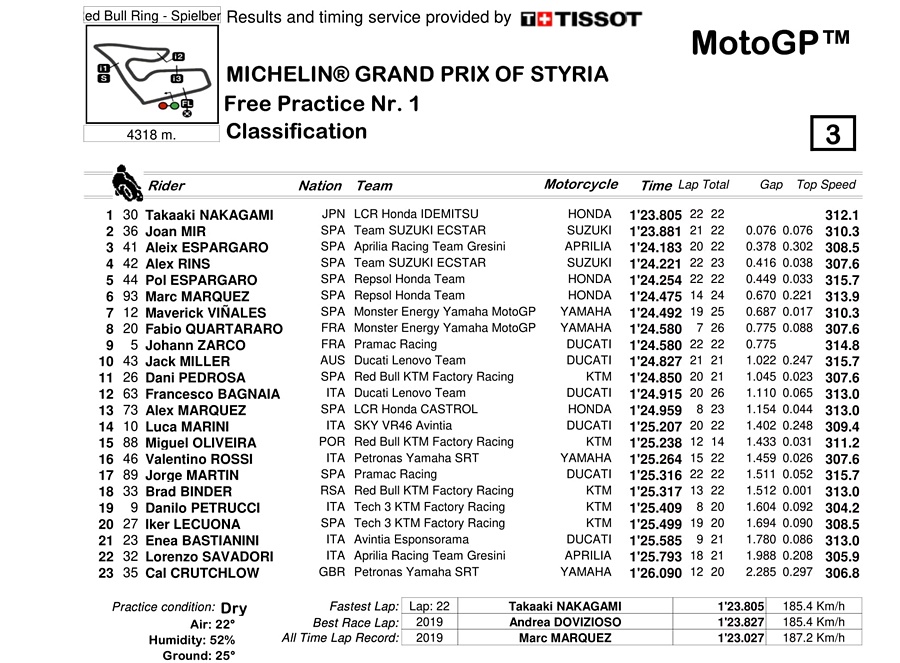 Adalah pembalap asal Jepang, Takaaki Nakagami. Penunggang RC213V tersebut berhasil mencatat waktu terbaik di sisi pembuka ini. Andalan LCR Honda Idemitsu torehkan best time 1’23.805s.