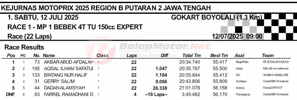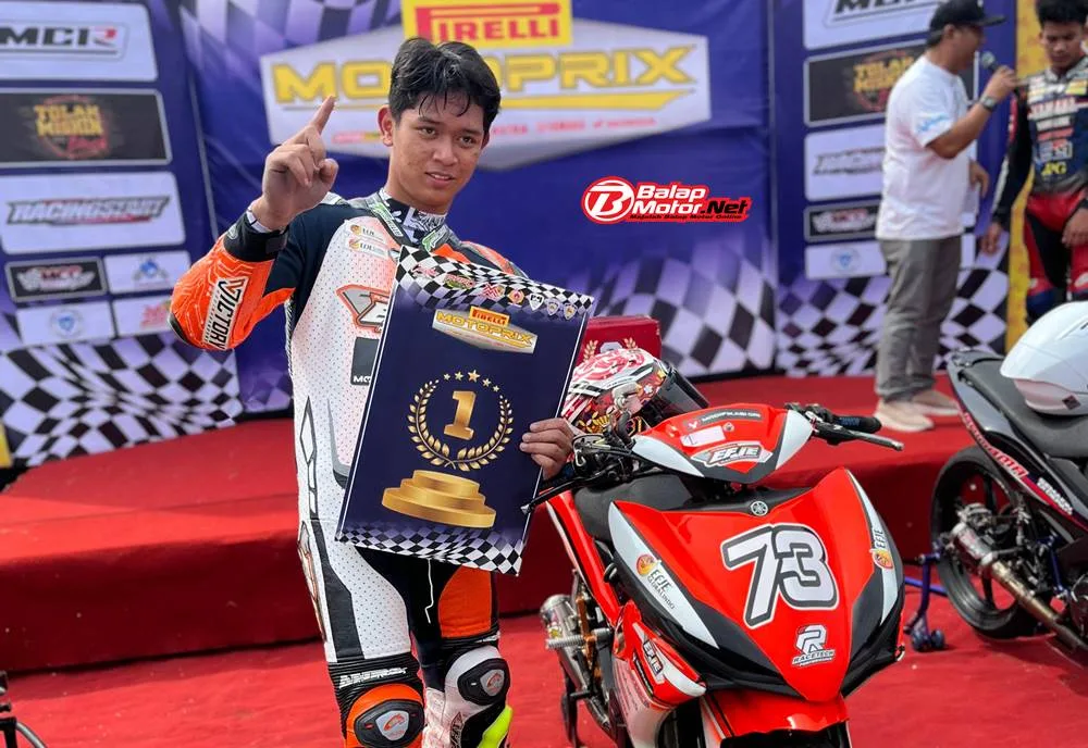 BalapMotor.Net – Tak mau turun, Akbar Abud sukses menapaki podium terhormat lagi di pertarungan MP1 Kejurnas Motoprix Region B 2025.