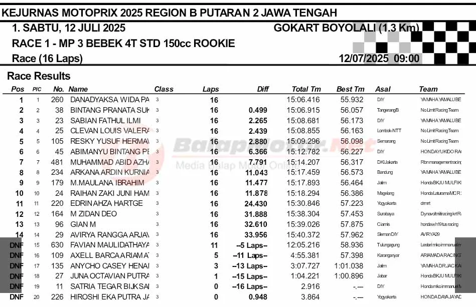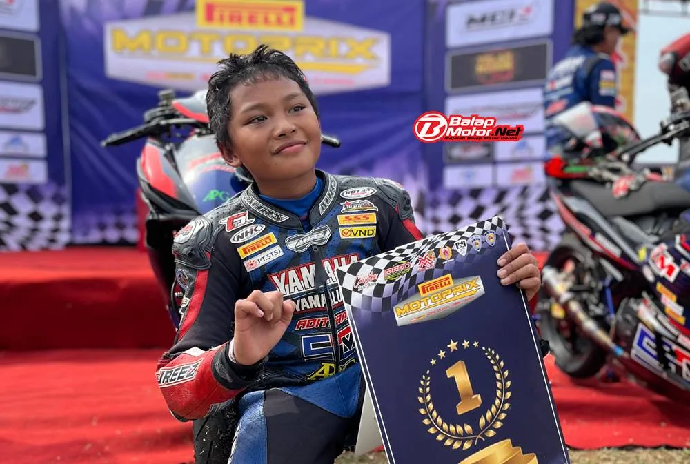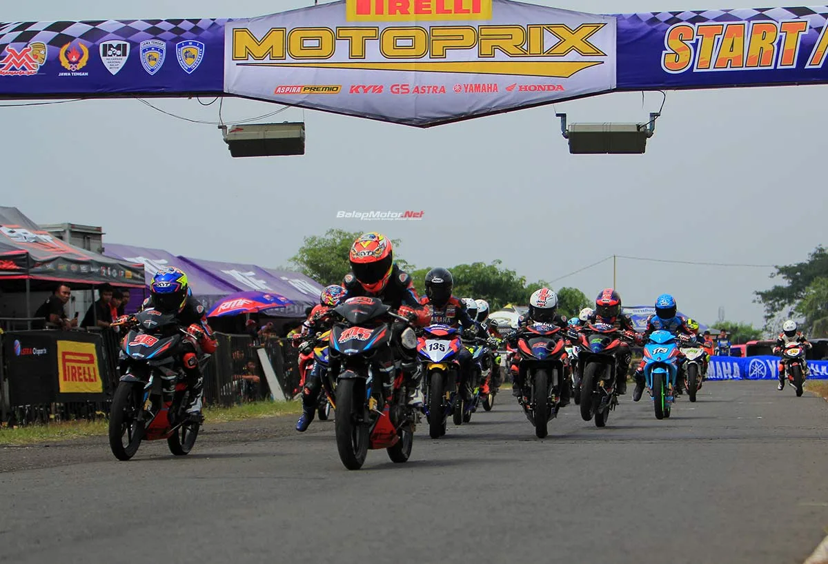 BalapMotor.Net – Persaingan sengit mewarnai Race 1 kelas MP3 Bebek 4T STD 150cc Rookie dalam gelaran Kejurnas Motoprix 2025 Region B Putaran 2 yang berlangsung di Sirkuit Gokart Boyolali, Jawa Tengah, pada Sabtu, 12 Juli 2025. Dalam balapan sepanjang 16 lap ini, duel ketat antara para pembalap muda berbakat usia dibawah 16 tahun ini terjadi sejak lampu start menyala.