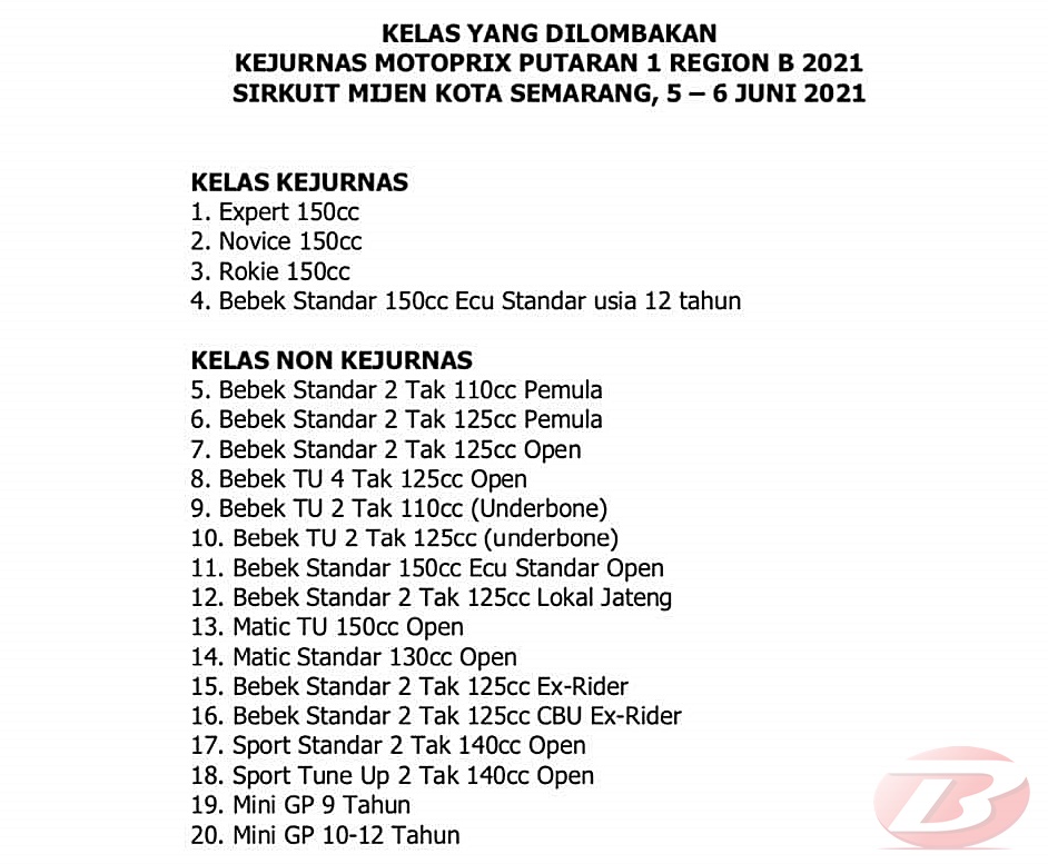 BalapMotor.Net – Partai pembuka Kejurnas Motoprix Region B siap disajikan di sirkuit Mijen, Kota Semarang – Jawa Tengah pada 5-6 Juni 2021. Masih ada waktu sekitar tiga minggu lagi untuk melakukan persiapan.