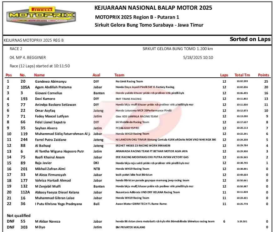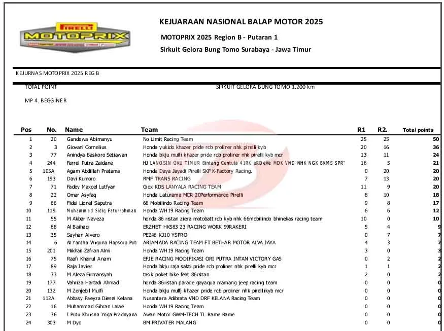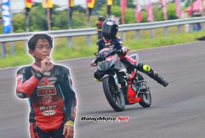 BalapMotor.Net – Belum terbendung. Gandewa Abimanyu kembali sukses merebut podium pertama di pertarungan MP4 Beginner Kejurnas Motoprix Region B Seri 1 di sirkuit GBT Surabaya.