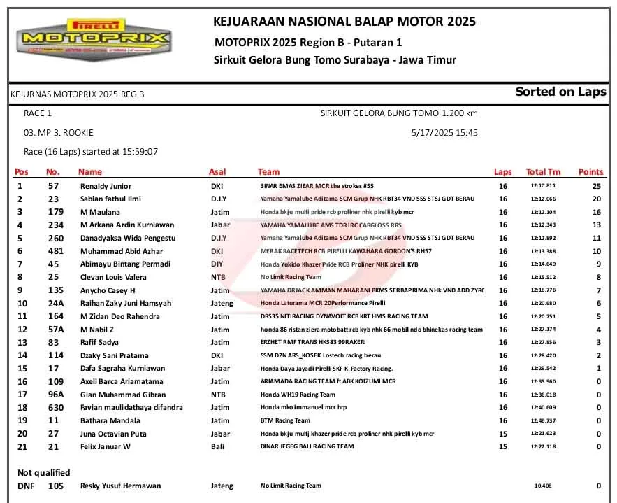 Pada kelas MP3 ini Reynaldi sendiri sempat mengalami masalah saat QTT. Ia hanya berada di posisi kelima. Namun saat race 1 berlangsung ia bisa melahap satu persatu lawan hingga finis terdepan.