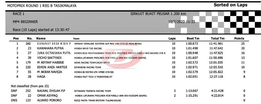 BalapMotor.Net – Race 1 Beginner di Kejurnas Motoprix Region B putaran pertama di sirkuit Bukit Peusar, Tasikmalaya benar-benar didominasi oleh Danadyaksa Widya Pangestu.
