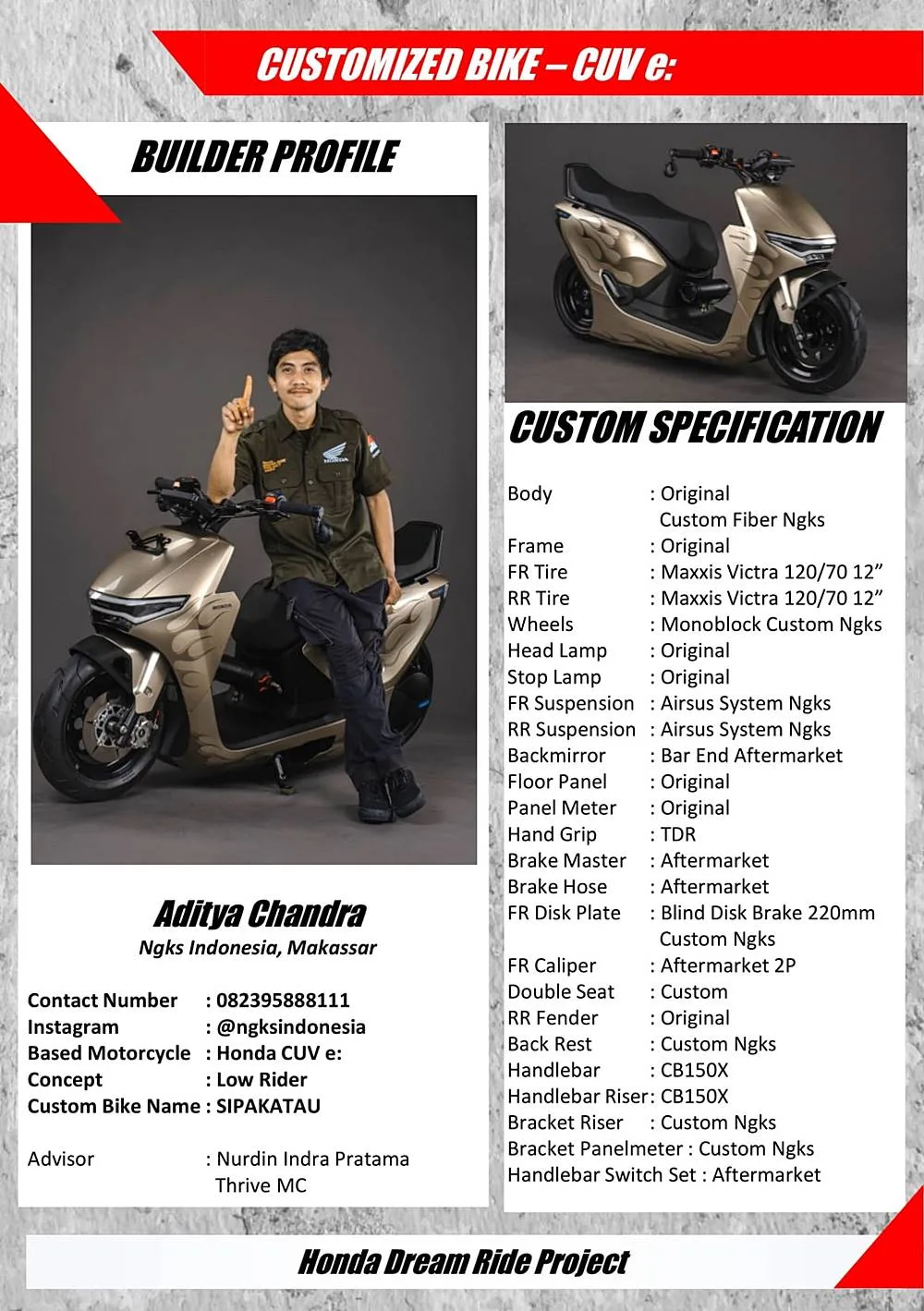 Lutvia mampu memberikan sentuhan gaya Urban Sport pada Honda CUV e; yang mengedepankan sisi gaya jalanan yang sporty dan sentuhan nuansa futuristik. Berbeda gaya dari rekannya, Aditya menghadirkan gaya Low Ride pada Honda CUV e: yang merubah ketinggian suspensi dan penggunaan ukuran ban yang lebih besar sehingga memberikan kesan kekar namun tidak menghilangkan sisi futuristik.