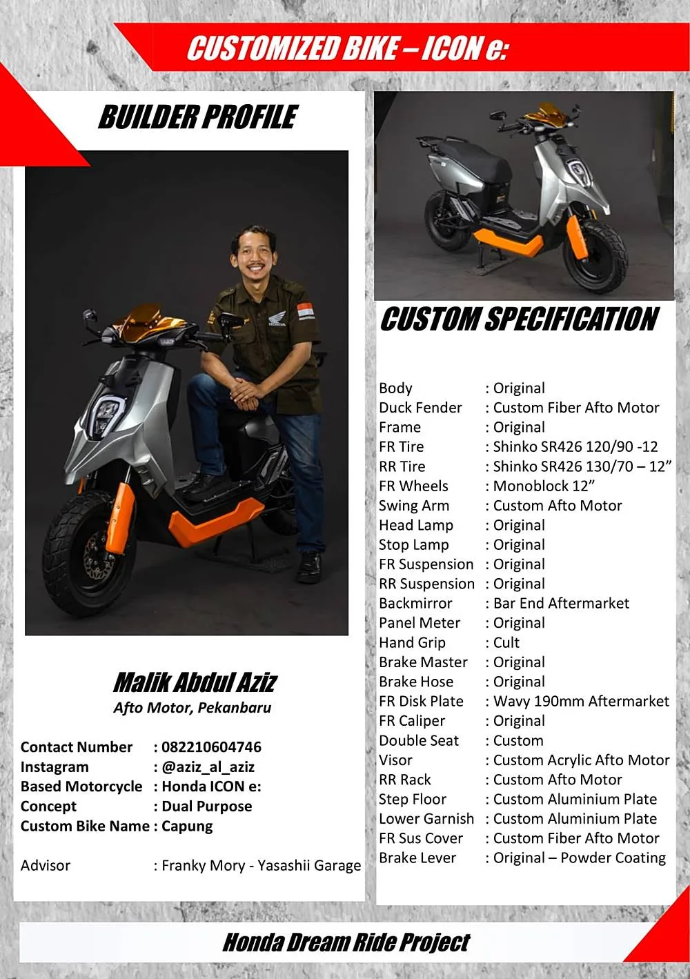 Peserta lainnya yakni Malik menghadirkan Honda ICON e; bergaya Dual Purpose dengan merubah desain Swing Arm, Shock Breaker yang lebih tinggi hingga penggunaan ban semi Off Road yang mempertahankan desain Body yang Compact.
