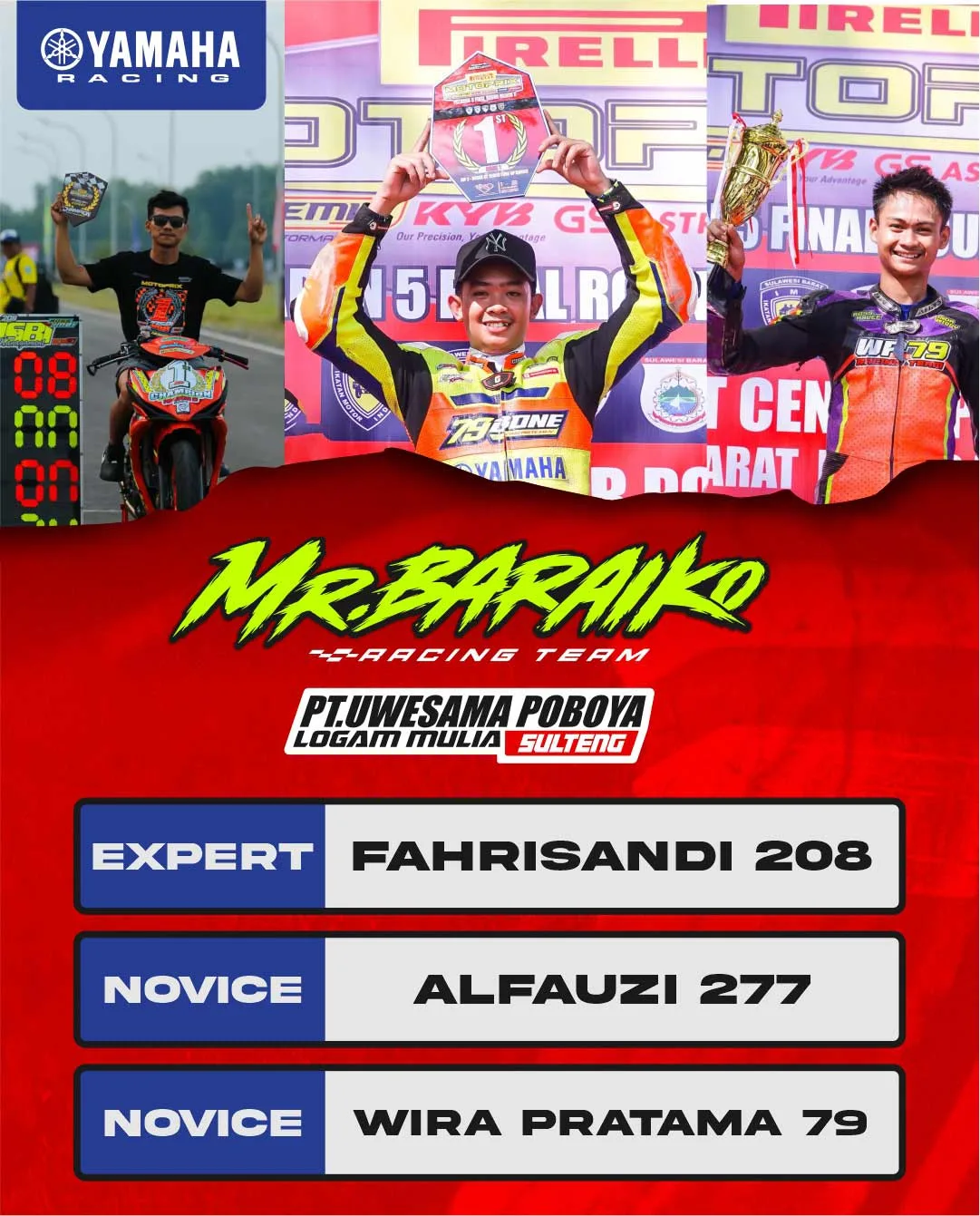 BalapMotor.Net – MR Baraiko Racing Team resmi mengumumkan tiga pembalap yang akan menjadi ujung tombak tim pada ronde pembuka Kejurnas Motoprix Region Sulawesi serta Sulawesi Road Race Championship (SRRC) yang berlangsung di Polman akhir pekan ini.