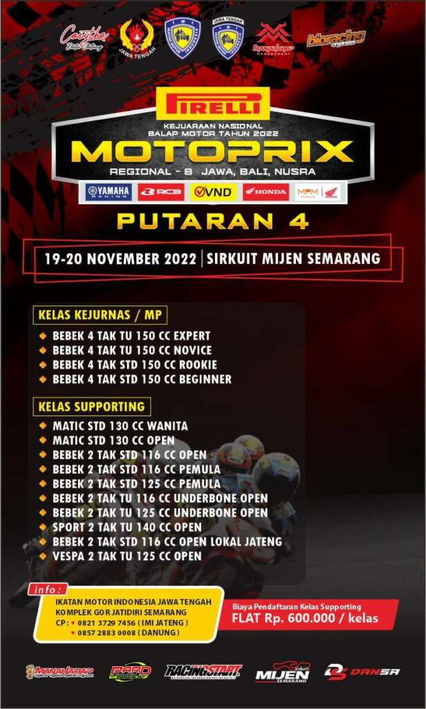 BalapMotor.Net – Kejuaraan Nasional balap motor Pirelli Motoprix Region B (Jawa, Bali dan Nusra) putaran ke-4 akan berlangsung di sirkuit Mijen, Semarang akhir pekan ini (19-20 November 2022).