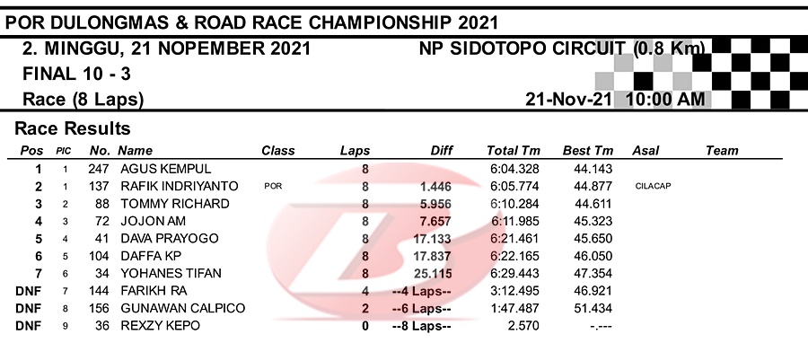 Setelah tercepat pada QTT hari Sabtu, RX-King racikan koh Bogel itu kembali menjadi yang terdepan saat final race (Minggu). Agus ‘Kempul’ Setiawan selaku joki sukses meninggalkan cukup jauh lawan-lawannya.