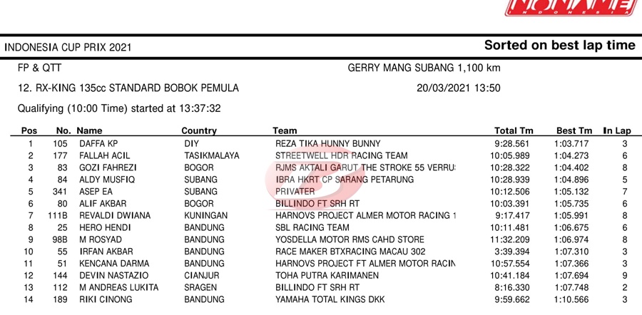 BalapMotor.Net – Daffa KP tampil brilian dalam jalannya Qualifying Time Trial (QTT) kelas RX-King STD Bobok Pemula kejuaraan Indonesia Cup Prix (ICP) Round 1 yang berlangsung di sirkuit Gery Mang, Subang (20/3).