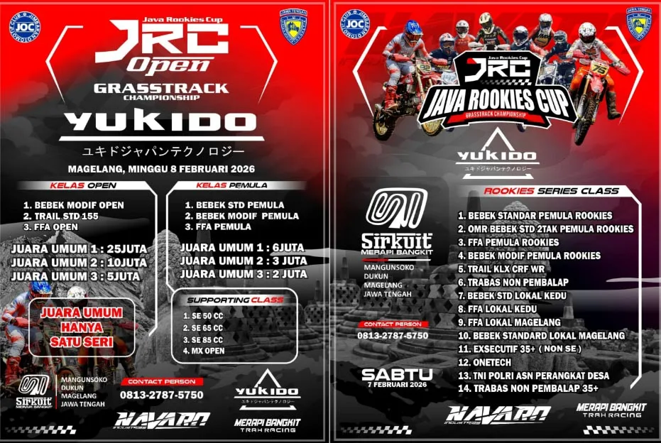BalapMotor.Net – Sekali balap langsung banjir hadiah juara umum! Yup, itu event yang siap disajikan oleh Navaro dan Yukido dengan titel Java Rookies Cup (JRC) Open Grasstrack Championship.