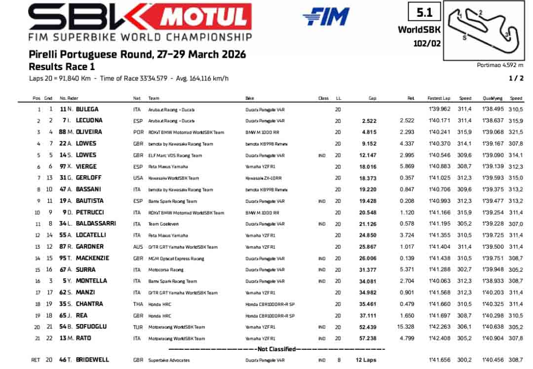 BalapMotor.Net – Nicolo Bulega sukses meraih podium juara di Race 1 Kejuaraan Dunia Superbike yang berlangsung di Autódromo Internacional do Algarve, Portimao, Portugal pada Sabtu 28 Maret 2026.
