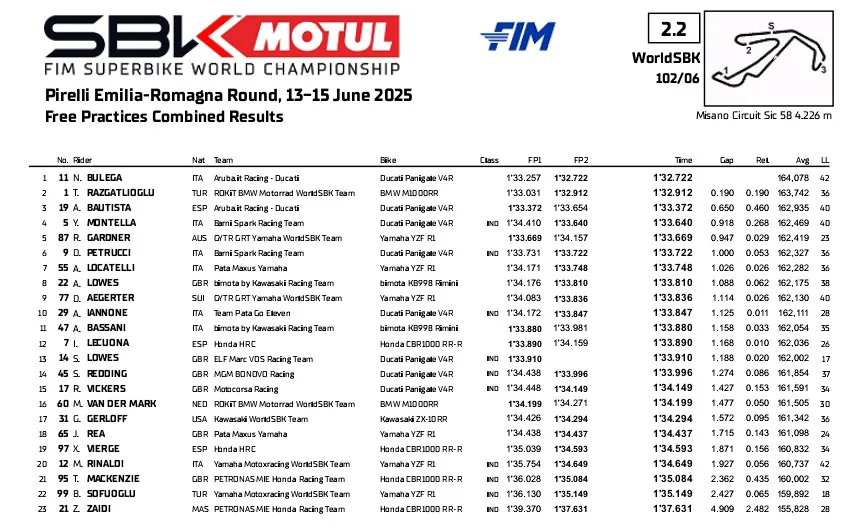 Namun Bulega sukses melebihi best time pembalap BMW itu di FP2. Hasil ini pun jadi modal bagus bagi Bulega sebagai tuan rumah. Walaupun sesi kualifikasi sendiri baru berlangsung besok Sabtu.