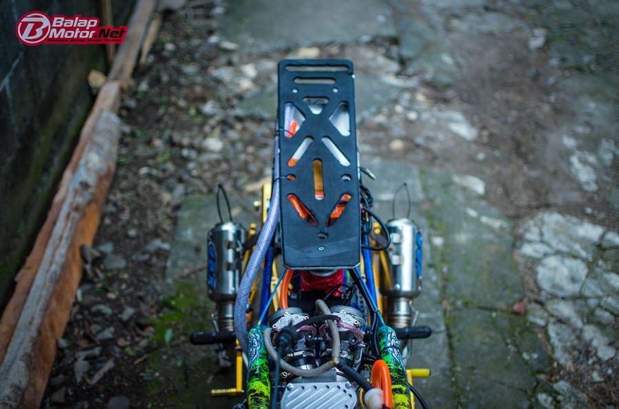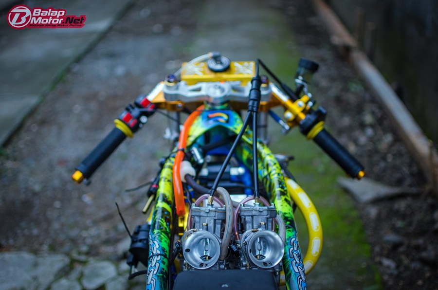 “Karena cc nya sudah besar maka kita mengacu dari motor balap Thailand mas sekarang banyak yang pakai 2 Throttle Body, kita coba pakai karburator dulu, mudah-mudahan kedepannya bisa ganti ke Injection,” ungkap Ridlo Khasani sang pemilik Aquaman sekaligus owner brand apparel terkenal di indonesia yaitu Racingstart.