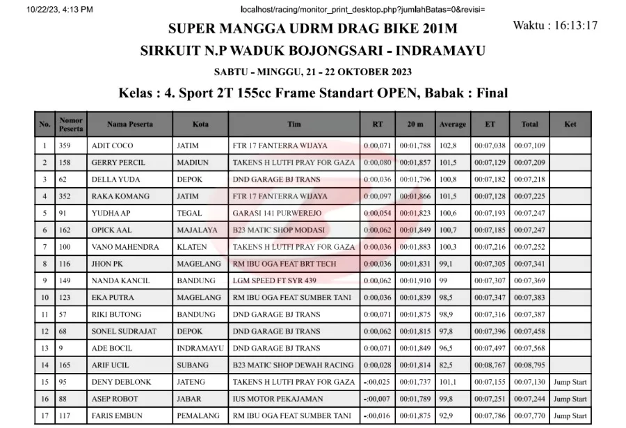 Coco yang memacu motor Fanterra racikan Wijaya Racing bertengger di posisi terbaik. Ia torehkan best time di angka 7,1 detik sendirian. “Alhamdulillah gak sia-sia perjuangan jauh dari Kediri ke Indramayu,” kata Adit Coco.