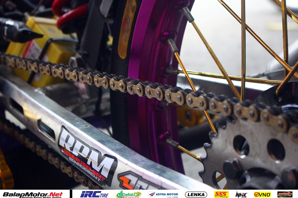 Disisi lain, Ninja FFA racikan mekanik koh Bogel dari Cobra Pantura itu juga ditopang part-part handal. Seperti rantai RK yang terbukti kualitasnya. “Ini rantai yang bagus dan kuat meladeni power besar FFA,” papar Rully PM.