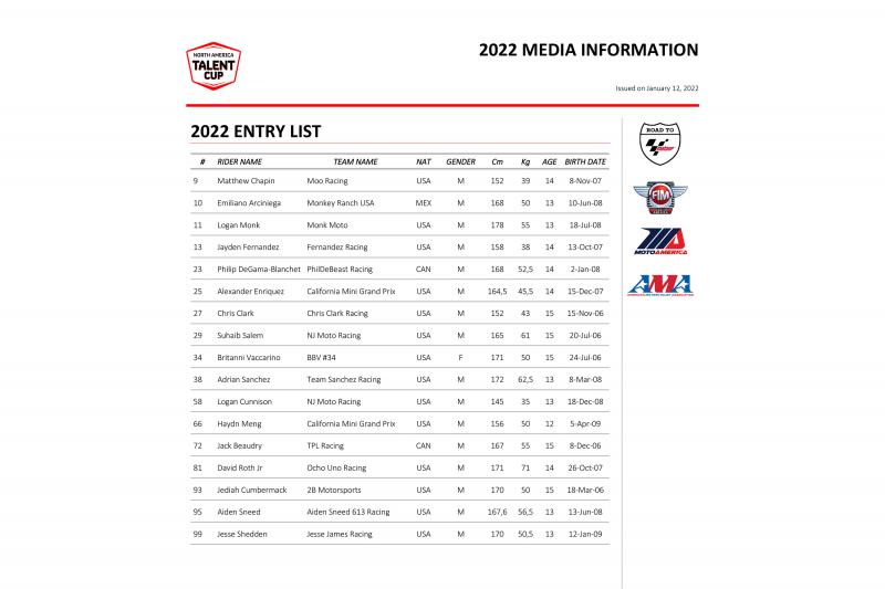 Dorna sendiri telah mengumumkan entry list peserta untuk NATC musim 2022 ini.Sebanyak 17 pembalap muda sudah terdaftar dan siap bertarung. Berikut entry list NATC 2022 :