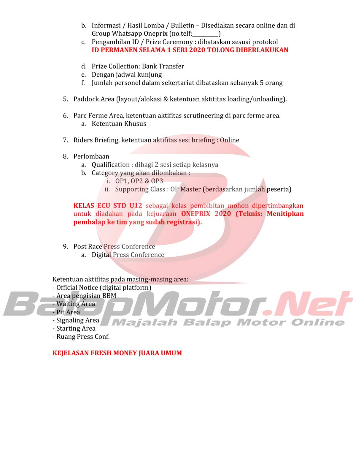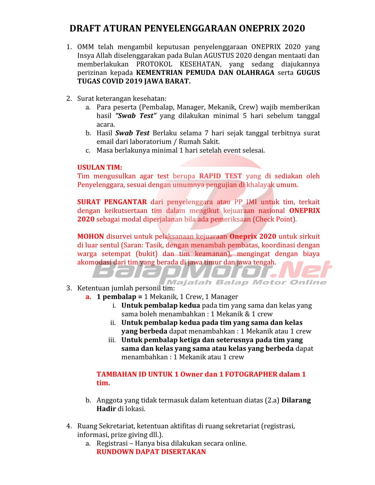 Berikut “DRAFT ATURAN PENYELENGGARAAN ONEPRIX 2020”