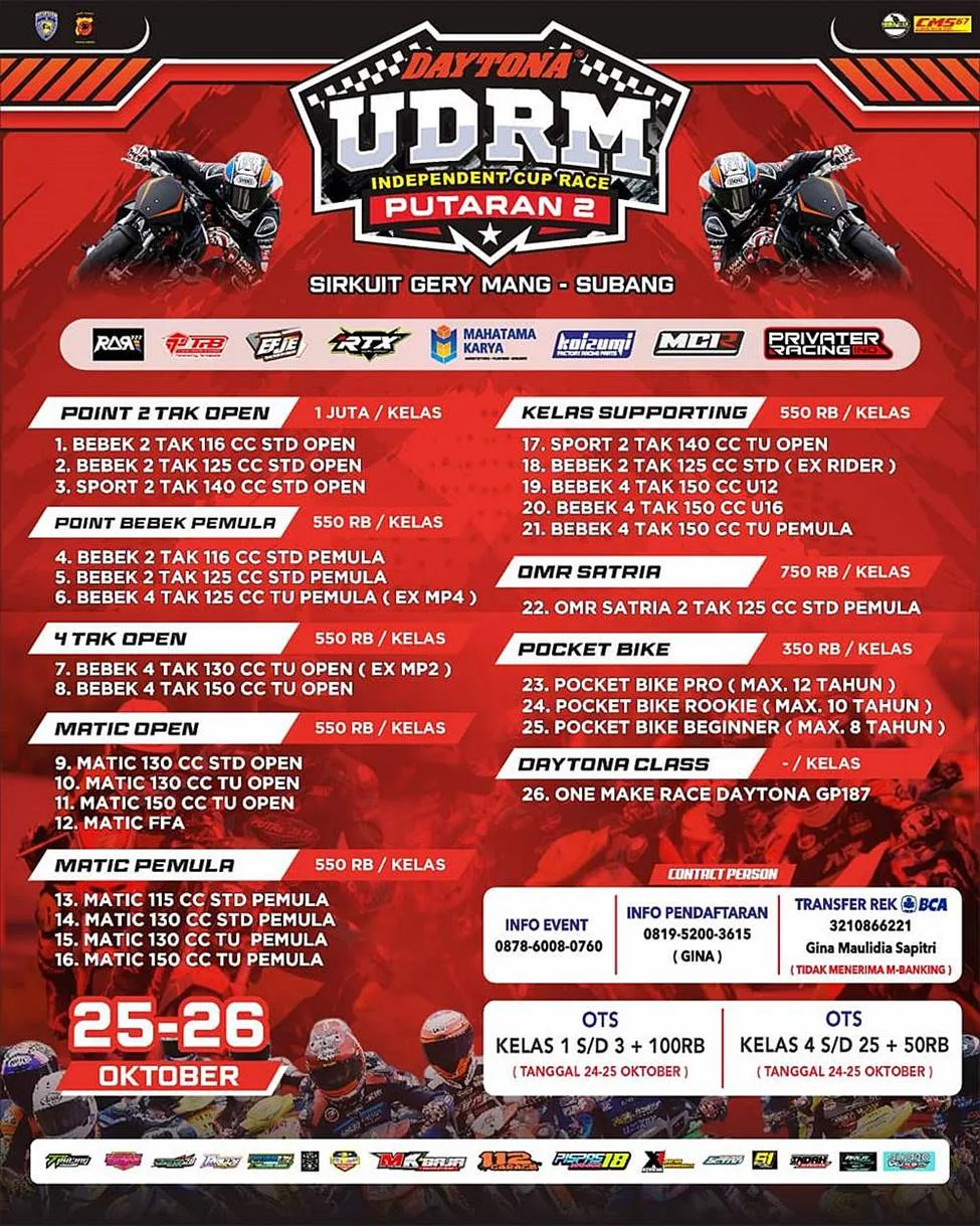 Karena ini merupakan kelas pembinaan, UDRM sendiri akan menghadirkan sistem 2 race. “Jadi di hari Sabtu ada sesi FP, lalu QTT dan Race 1. Lalu pada hari Minggu race 2,” tambah Uciel Deo.