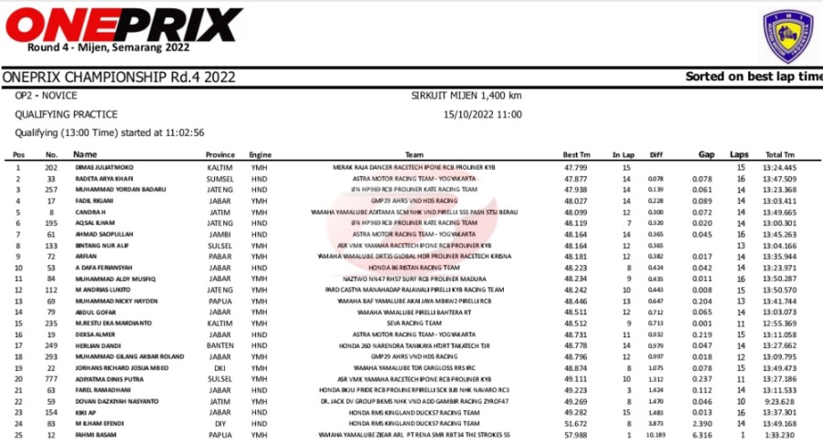 Pembalap Merak Raja Dancer tersebut mencatat waktu terbaik 47,799 detik. Dengan Yamaha MX-King garapan Racetech, Dimas memang selalu konsisten mencatat waktu yang bagus.