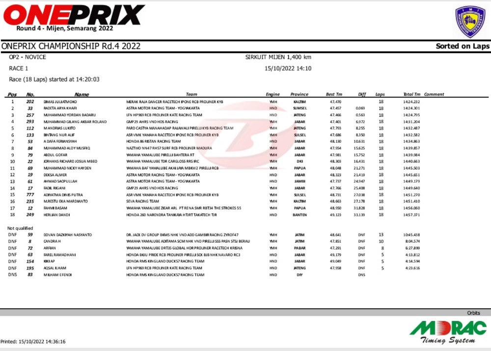 Mereka silih berganti memimpin jalannya balapan. Namun, hasil akhir Dimas tetap mempertahankan posisi terbaik. Berikut hasil Race 1 OP2 Oneprix Mijen 2022.