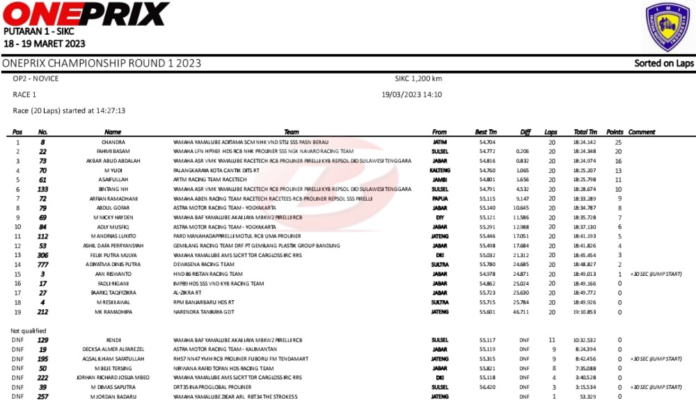 BalapMotor.Net – Chandra Hermawan keluar sebagai jawara di pertarungan Race 1 OP2 (Novice) kejuaraan nasional Oneprix 2023 putaran pertama yang berlangsung di sirkuit Sentul Karting, Bogor (18/3).