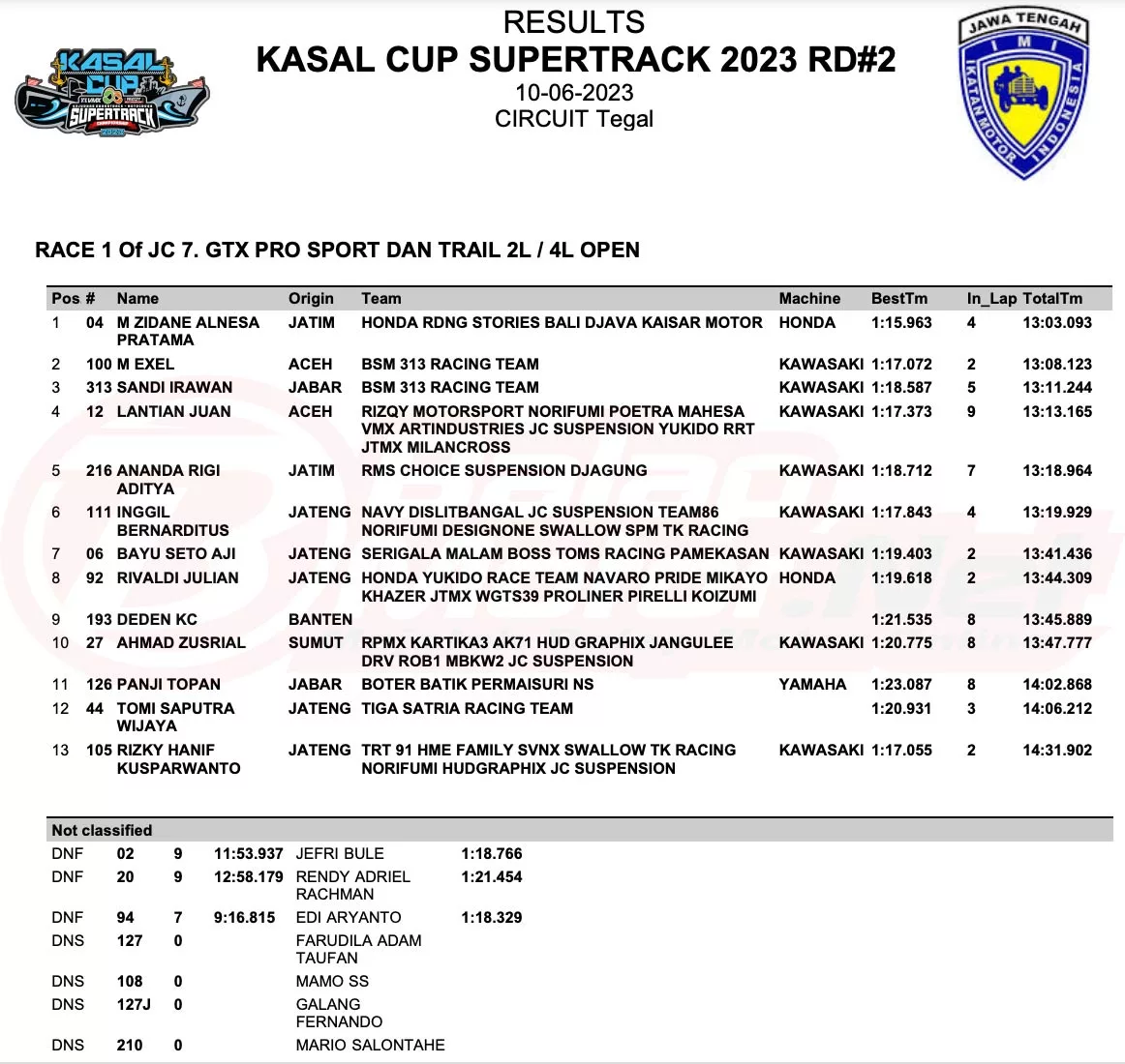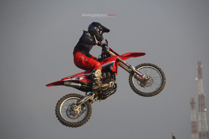 BalapMotor.Net – Menunggangi Honda CRF150L dari tim Honda RDNG Stories Bali Djava Kaisar Motor, M Zidane Alnesa Pratama tampil tak terlawan dalam race 1 JC7 GTX Pro Sport & Trail 2L/4L Open ronde kedua Kasal Cup JC Supertrack 2023 yang digelar di sirkuit Bung Karno, Kota Tegal pada hari Sabtu (10/6).