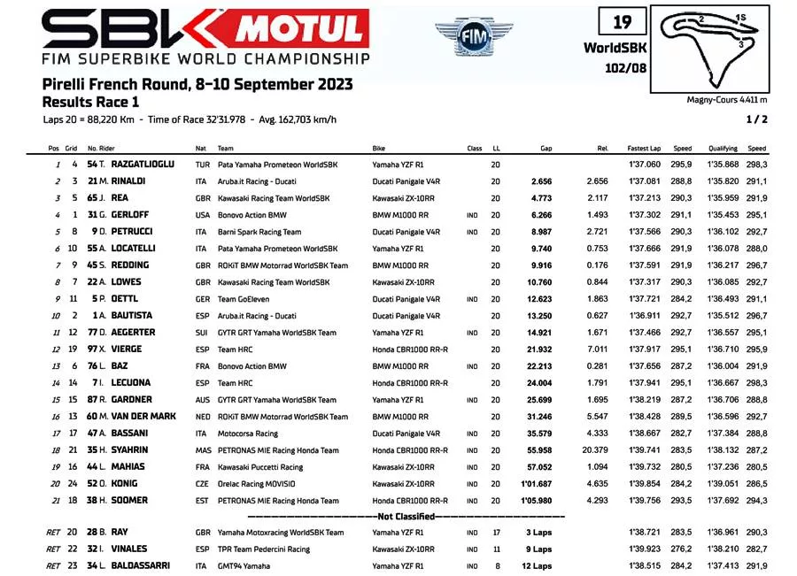 BalapMotor.Net – Toprak Razgatlioglu berhasil mengamankan podium juara Race 1 WorldSBK di sirkuit Magny-Cours, Prancis Sabtu kemarin. Pembalap Yamaha itu pun memangkas jarak poin yang cukup bagus dari Bautista.