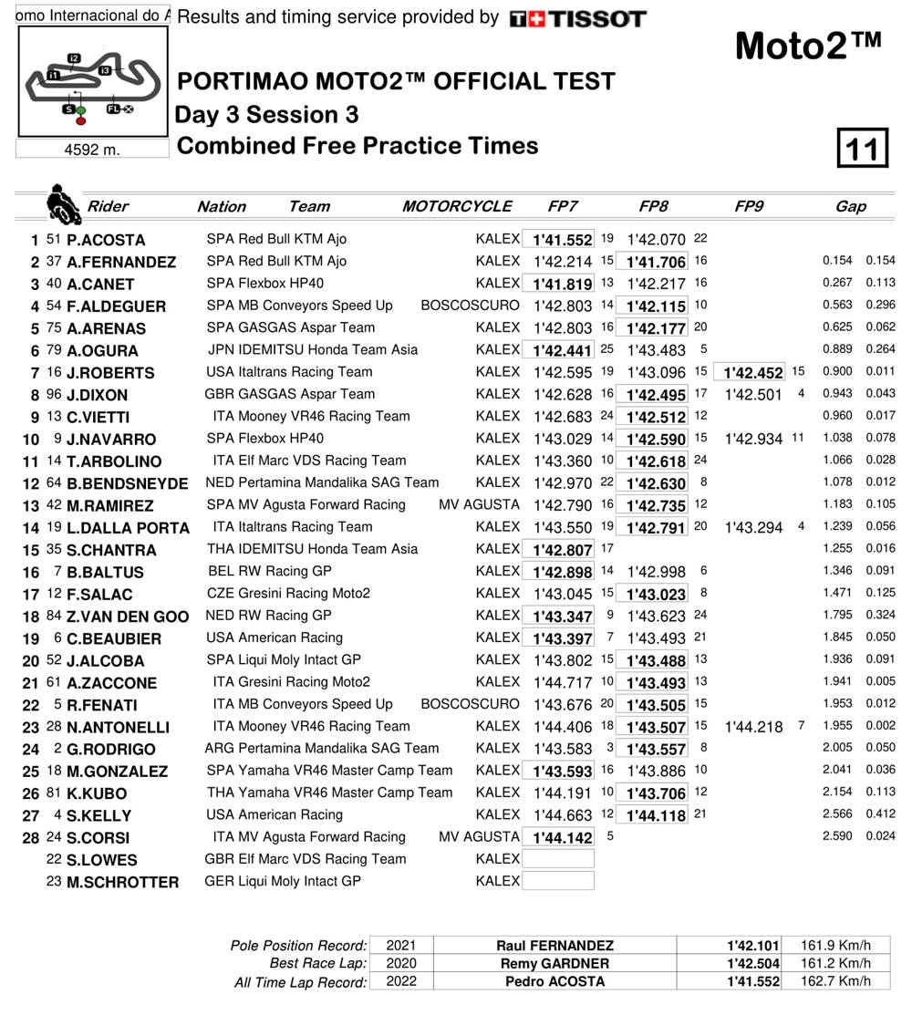 Pada sesi tes pramusim Moto2 selama tiga hari di Portimao, Portugal, pembalap Spanyol berusia 17 tahun ini langsung jadi pembalap tercepat. Tidak hanya itu, Pedro Acosta juga mampu memecahkan rekor time Moto2 di sirkuit tersebut.
