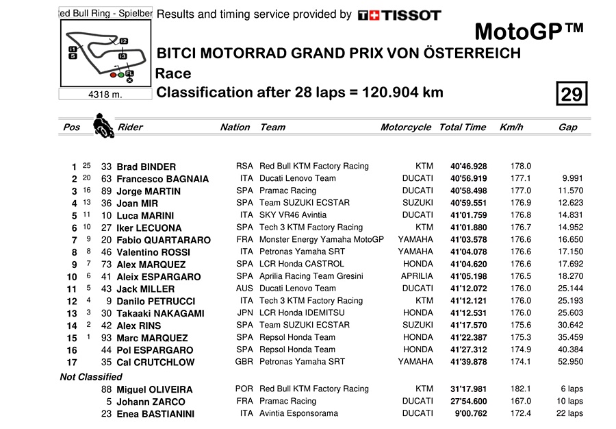 “Bagi saya, saya marah ketika saya memulai putaran terakhir karena saya P10. Saya melihat sejauh itu, jauh ada grup, tetapi saya tidak berpikir bahwa ada sembilan pembalap. Jadi ketika saya tiba di tikungan empat, saya menyalip Nakagami dan pembalap lain dari tikungan enam hingga tujuh,” ungkap Bagnaia.