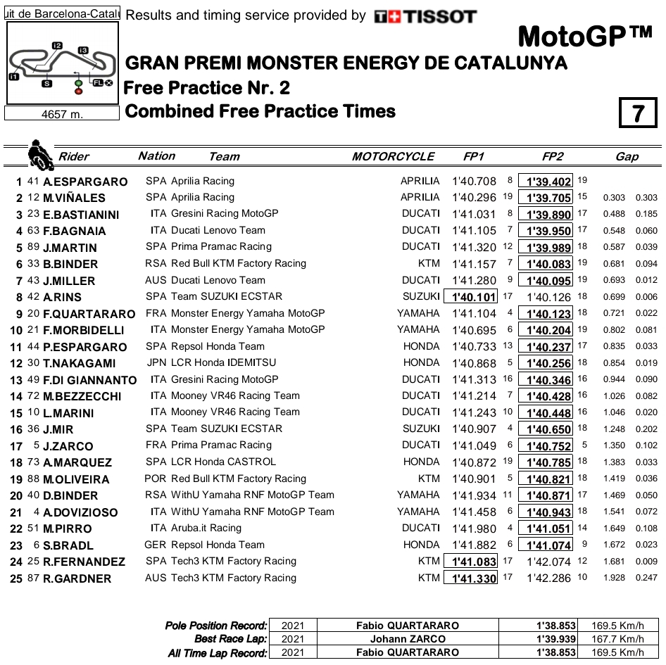 Pecco harus mengakui keunggulan duo pembalap Aprilia Racing Team, Aleix Espargaro tercepat disusul rekan setimnya Maverick Vinales di urutan kedua. Bagnaia pun tertinggal sekitar setengah detik.