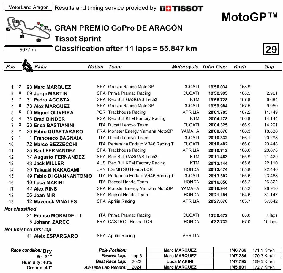 Start dari urutan ketiga, posisinya justru semakin melorot dan harus puas finis di posisi kesembilan saja. Hasil yang membuatnya harus menyerahkan puncak klasemen kepada Jorge Martin.