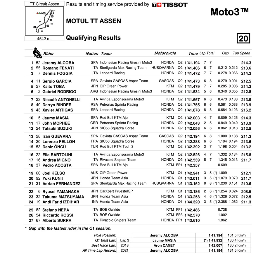 Berikut hasil kualifikasi Moto3 Assen-Belanda 2021: