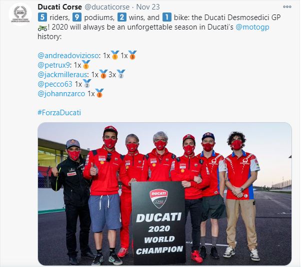 Terlihat dalam cuitannya, Ducati menyebut 5 pembalap saja, tanpa ada nama Tito Rabat yang juga melakoni balapan terakhirnya di MotoGP. Tentu cuitan ini mengundang banyak komentar pro dan kontra. Ada yang mengkritik cuitan ini karena Ducati tak adil ke Tito Rabat.