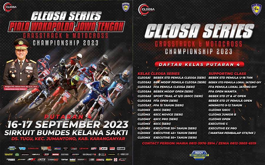 BalapMotor.Net – Sepekan lagi, kejuaraan garuk tanah bergengsi Cleosa Series Grasstrack & Motocross Championship 2023 akan berlangsung di sirkuit Bumdes Kelana Sakti, Karanganyar, Jateng (16-17 September 2023).