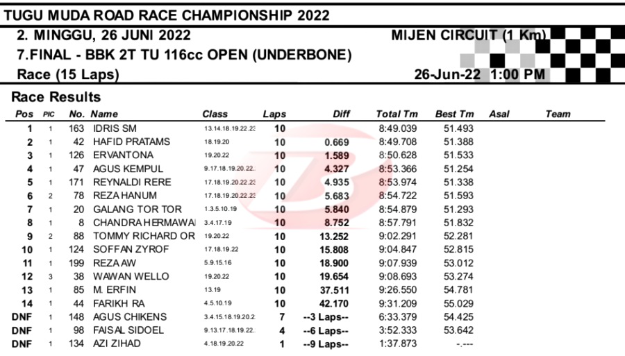 Tapi tak bisa merubah settingan lainnya. Race berjalan dan Idris SM yang mengawali start dari posisi kedua tampil dengan sangat bagus. Pembalap Madura itu tampil tenang dan berhasil menjadi juara. Ini gelar juara kesekian kalinya bagi pacuan berwarna kuning tersebut.