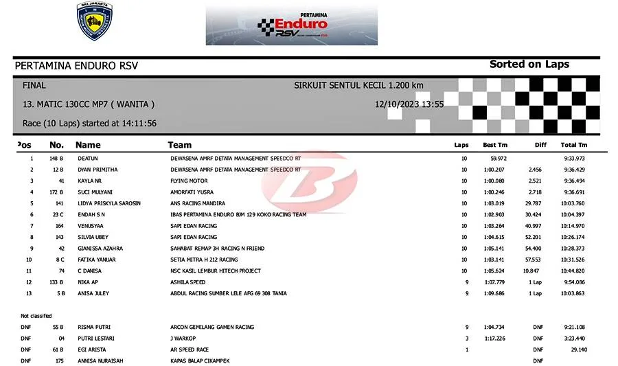 BalapMotor.Net – De Atun bangkit lagi. Pembalap asal Subang tersebut sukses menjadi ratu wanita di kejuaraan Pertamina Enduro RSV Racing Championship yang berlangsung di sirkuit Sentul Karting, Bogor.