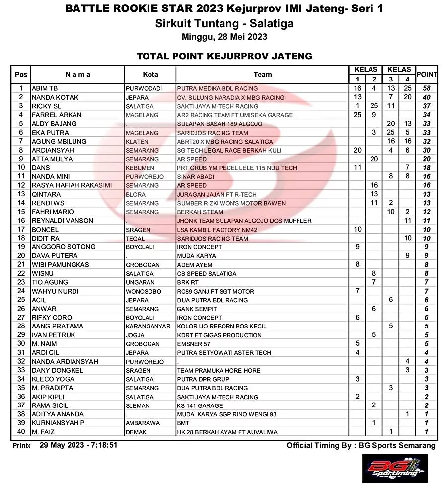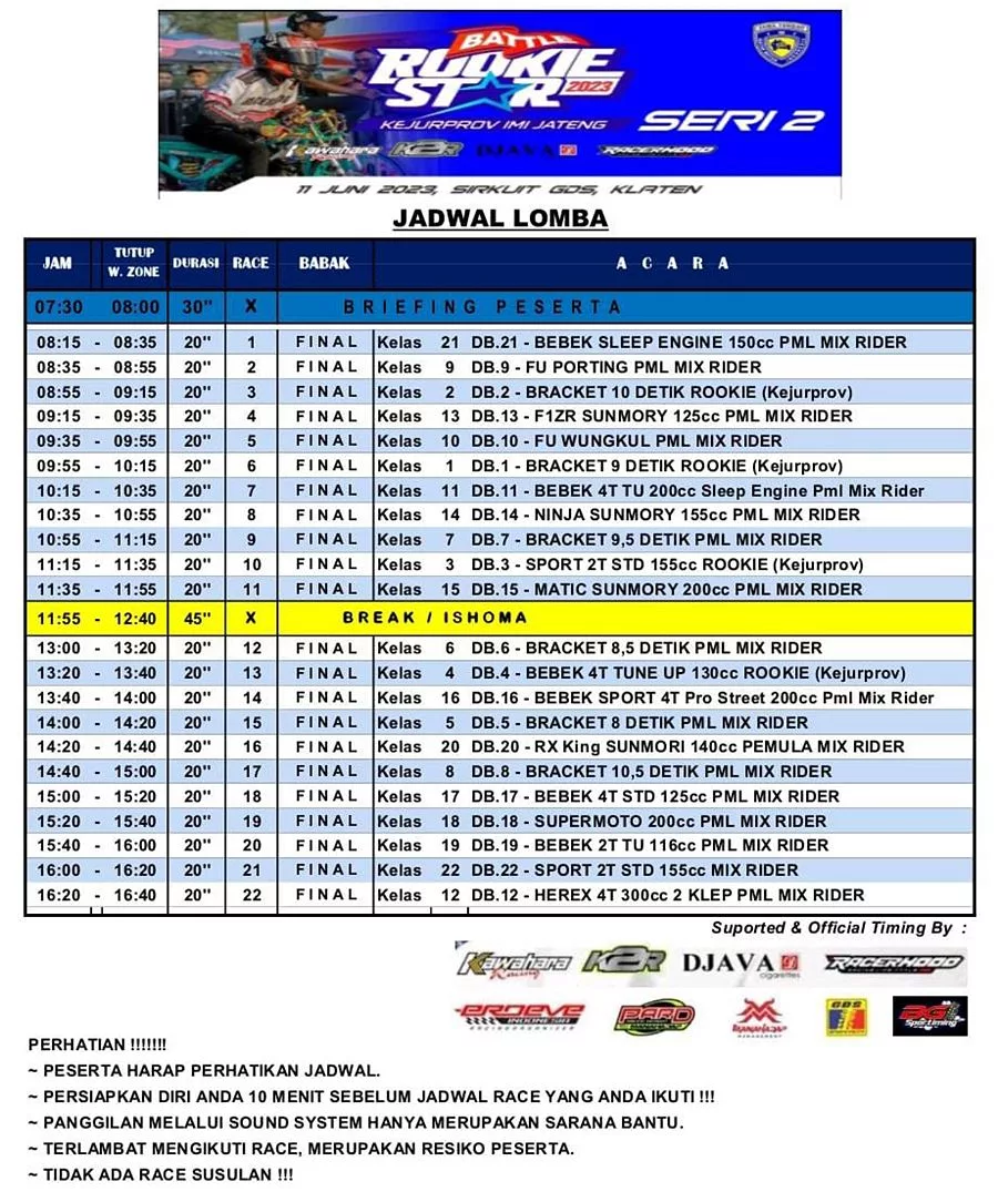 So, siapkan pacuan terbaik kalian. Apa lagi perebutan poin kelas utama masih rapat dan terbuka lebar untuk siapa saja. Bagi peserta yang akan tampil bisa simak jadwal acaranya agar tidak ketinggalan. #gaspol… (***)