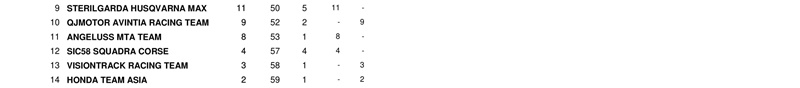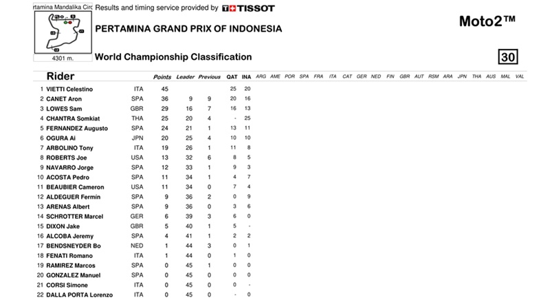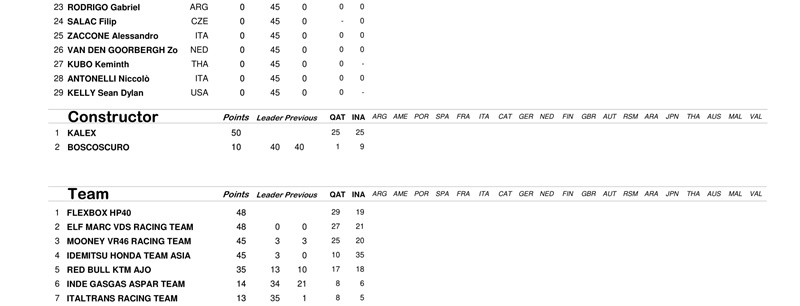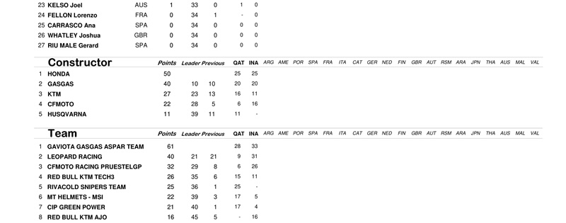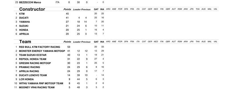 Dengan hasil ini, Tim Red Bull KTM Factory Racing berhasil memimpin poin konstruktor atau pabrikan untuk pertama kalinya. Mereka mengumpulkan 45 poin berkat podium kedua Brad Binder di Qatar dan podium juara Oliveira di Indonesia. KTM sementara unggul 4 angka dari Ducati.
