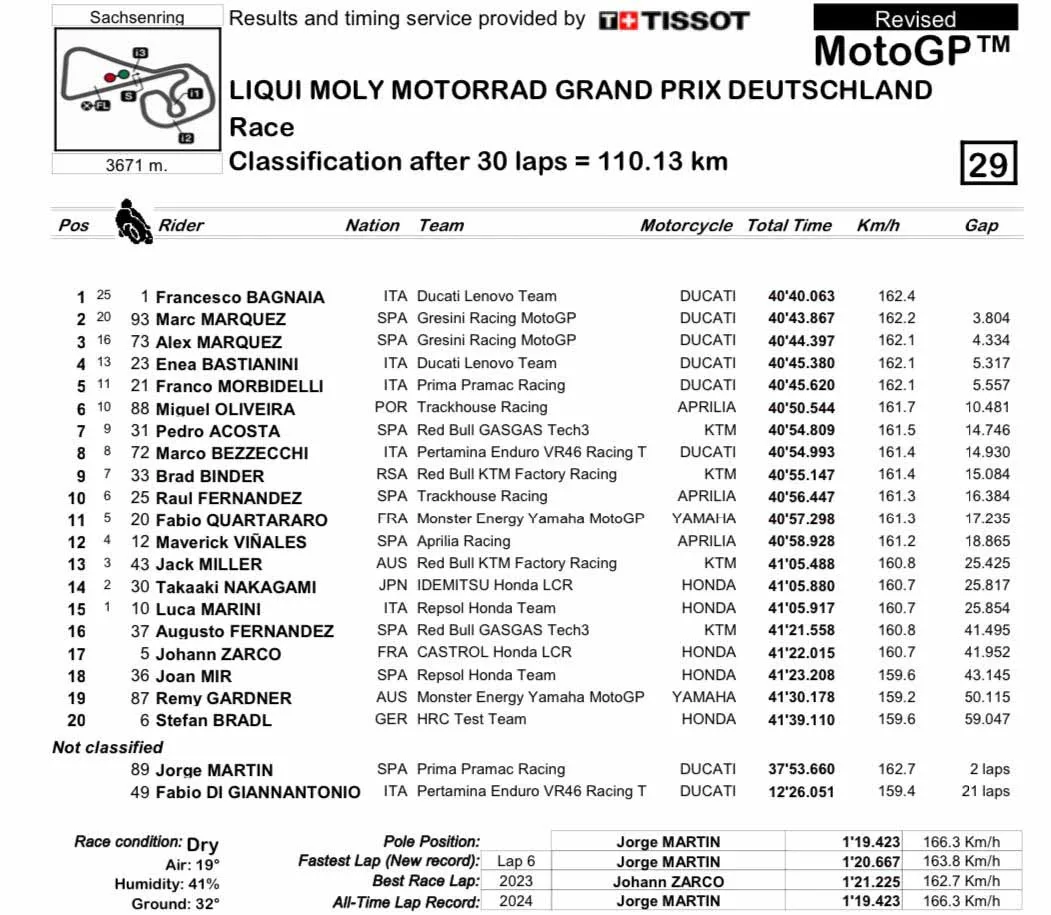 Terlebih lagi, Marc mengawali GP Jerman ini dengan banyak kendala. Hari Jumat ia mengalami kecelakaan serius. Jari tangan patah dan memar di tubuh. Start ke-13 dan finis di posisi keesnam pada Sprint. Namun podium di hari Minggu itu luar biasa.