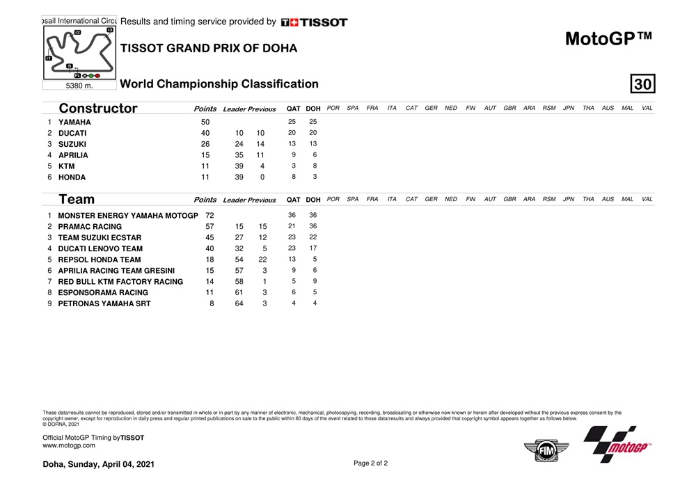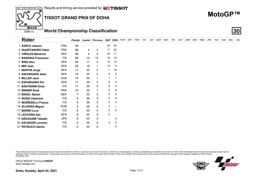 Hasil yang sama seperti putaran pertama membuat Zarco sementara ini memimpin klasemen kejuaraan dunia MotoGP 2021 dengan 40 poin. Unggul 4 angka dari duo Monster Energy Yamaha, Fabio Quartararo dan Vinales yang mengumpulkan poin sama 36.
