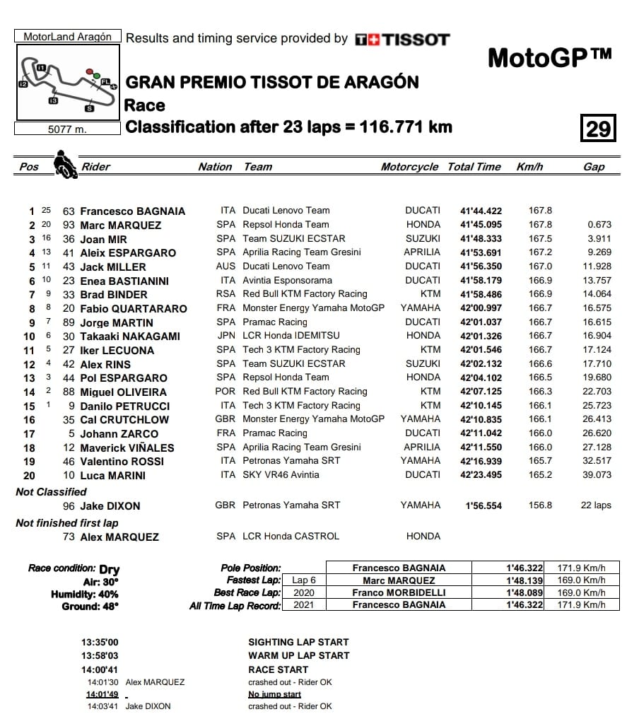 “Itu sepenuhnya salah saya, saya sangat menyesal untuk tim. Mereka melakukan pekerjaan dengan baik dan memberi saya motor yang sempurna. Sekarang saya harus mencoba melupakan akhir pekan secepat mungkin, karena secara keseluruhan itu tidak mudah bagi saya. Kami menantikan Misano, di mana kami akan bekerja lebih keras lagi,” ungkapnya.