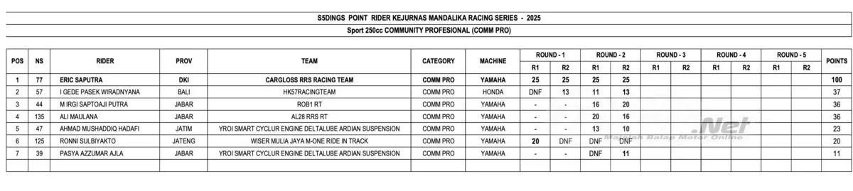 Lalu pada kategori National Sport 250 (NS250), Muh Murobbil Vittoni dari Yamaha LFN HP969 Global Ondolomon yang memimpin klasemen juga harus mewaspadai Arai Agaska dari Yamaha NitiRacing HDS karena hanya berbeda 12 poin saja.