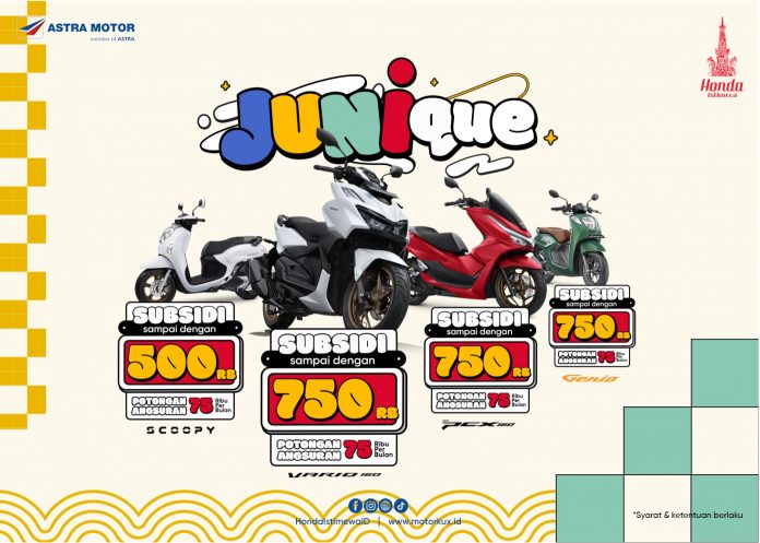 BalapMotor.Net – Astra Motor Yogyakarta berbagi promo penjualan bertajuk ‘JUNIQUE’ untuk memanjakan pecinta sepeda motor Honda di wilayah Yogyakarta, Kedu, dan Banyumas. Seluruh segmen sepeda motor Honda mendapatkan subsidi dan potongan angsuran untuk pembelian sepanjang bulan Juni. Program promo penjualan ini memberikan kesempatan bagi konsumen yang menginginkan sepeda motor Honda baru impian.